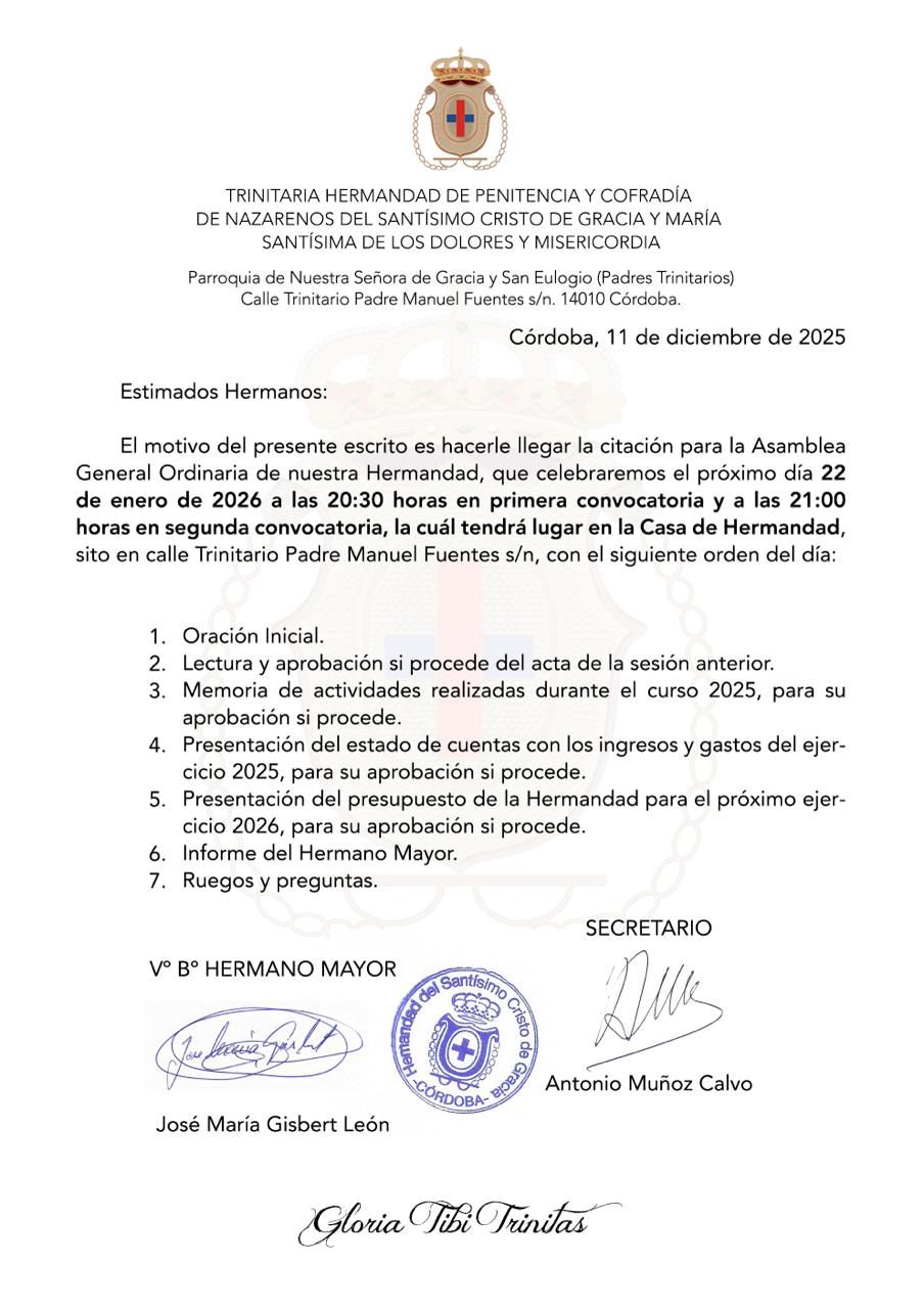 Jueves 22 de enero, a las 20:30 horas en primera convocatoria y 21:00 horas en segunda convocatoria, en la Casa de Hermandad (c/ Trinitario Padre Manuel Fuentes s/n).
