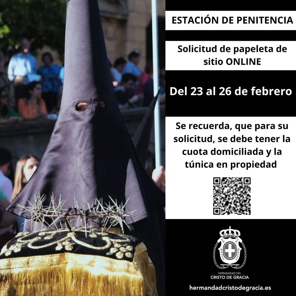 Informamos a nuestros hermanos/as con cuota domiciliada y túnica en propiedad, de la posibilidad de solicitar su papeleta de sitio online accediendo al formulario mediante el escaneo del código QR que se muestra en esta publicación. Para cualquier duda o consulta, pueden consultar con nosotros dirigiéndose a la dirección de correo electrónico estaciondepenitenciacdg@gmail.com Accede también a la solicitud de papeleta de sitio online en el siguiente enlace: https://docs.google.com/forms/d/16cEozGRKwoZ2zlqG8ildd5ykPFT_uWgc0scOlHPAZ28/viewform?edit_requested=true