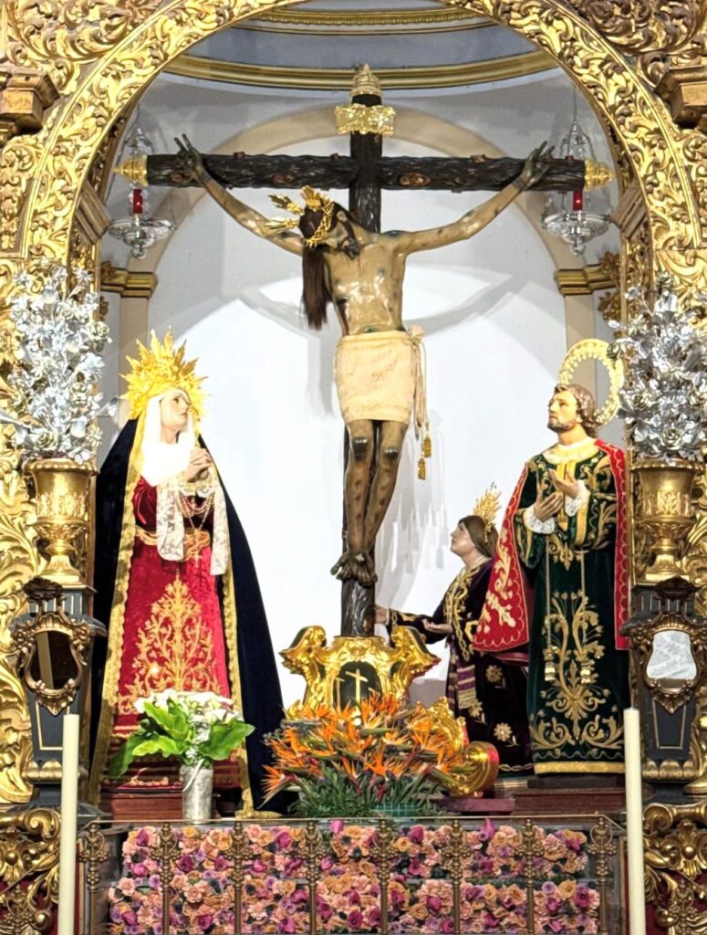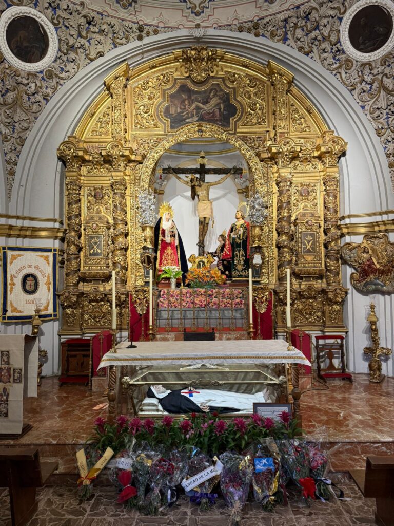 El Santísimo Cristo de Gracia y María Santísima de los Dolores y Misericordia, de nuevo dispuestos en su camarín junto a San Juan Evangelista y Santa María Magdalena, para recibir las oraciones de Hermanos, fieles y devotos en las vísperas de Resurrección.